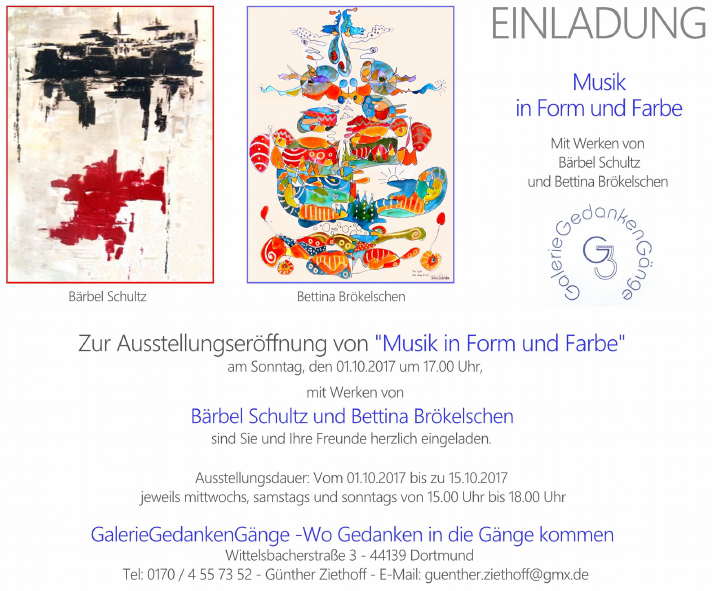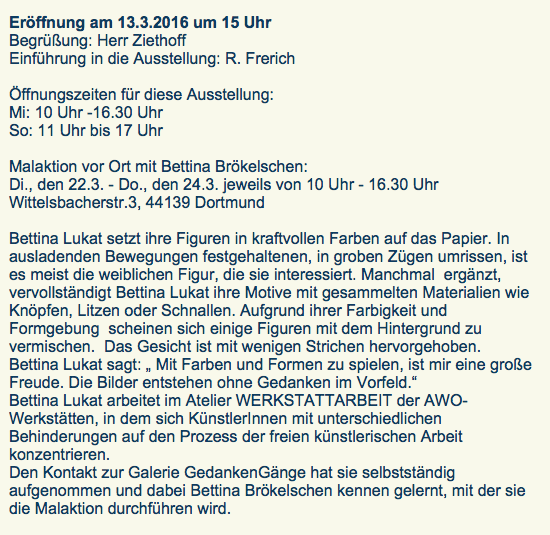 Während der Öffnungszeiten ist Frau Brökelschen anwesend und wird vor Ort weitere Bilder, ggf auch im Zusammenwirken mit den Besucher*innen malen.